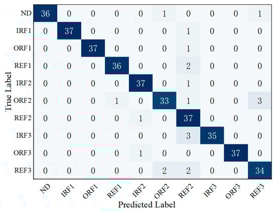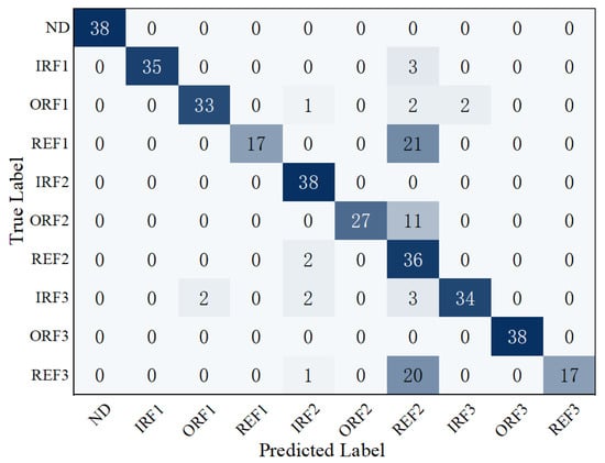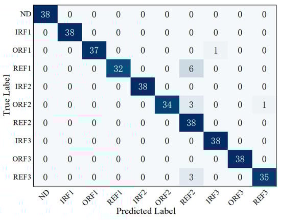 Figure 13 presents the confusion matrix obtained using the D-S evidence fusion method and selecting the category with the highest confidence value as decision result. Overall, the majority of classes show high values along the diagonal, and the total accuracy reaches 96.32%, demonstrating that D-S fusion effectively enhances classification performance. Nevertheless, misclassifications persist in certain classes; for instance, one ORF1 sample is misclassified as REF2, three ORF2 samples are incorrectly classified, and a few REF1 samples are confused. These results indicate that, while the fusion strategy improves overall recognition to a high level of accuracy, further optimization is needed for classes with similar feature characteristics to address residual errors and achieve even higher robustness.