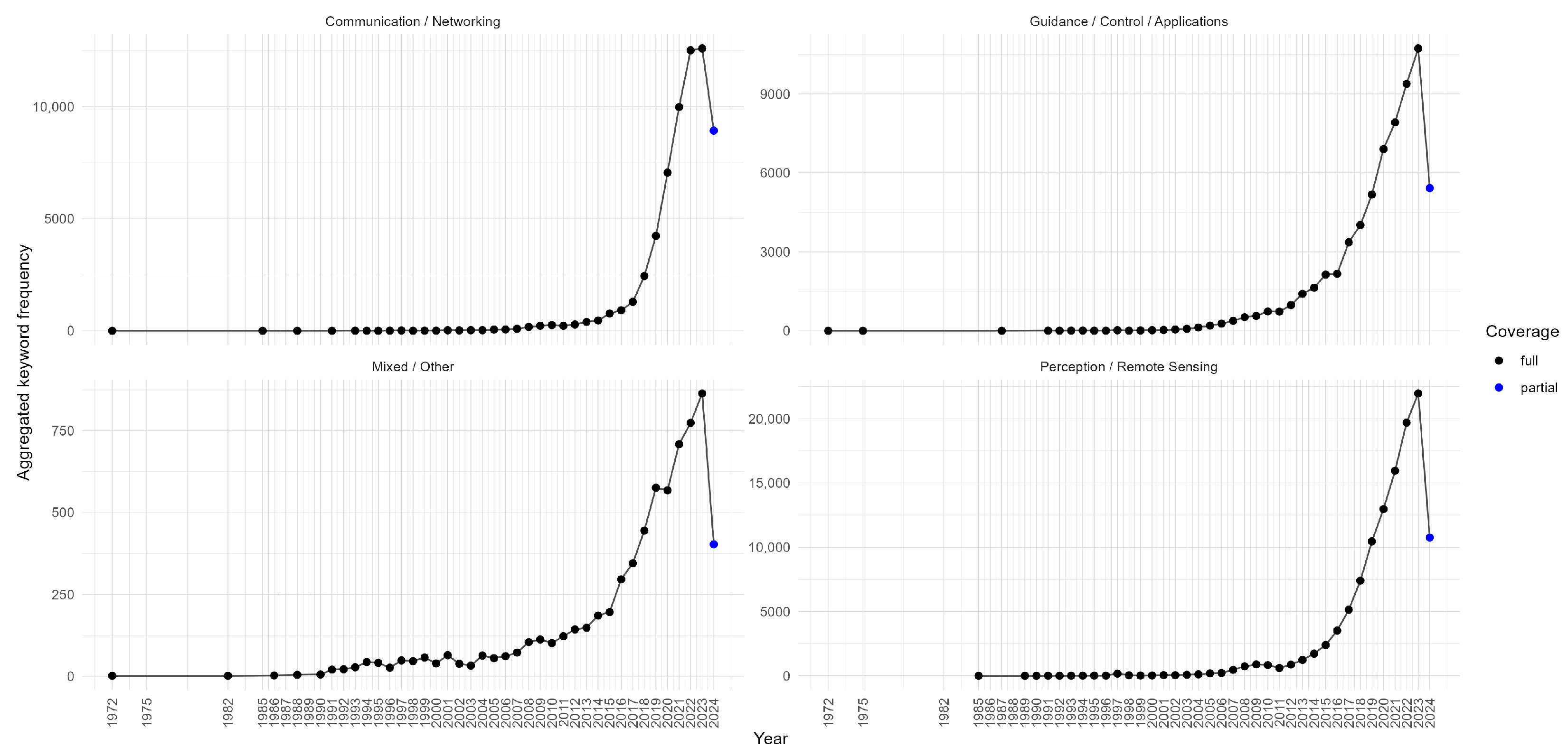 Regarding RQ1, the following can be stated: The annual series (1955–2024) shows long-term growth, which accelerated after 2010, in line with the phase when low-cost sensing, embedded computing, and open-source tools reached maturity. The last calendar year of the series is marked as partial, so the changes visible on the right-hand side should be interpreted as indexing delays rather than structural declines. More informative than the single descent is the thematic connection that emerges over time: reinforcement learning appears more and more frequently on the topic timeline alongside route/path planning and collision avoidance, indicating a shift from manual control to data-driven decision-making in the face of uncertainty and dynamics. At the same time, two technical constraints—energy and communication—remain. This is consistent with the durability- and connectivity-related performance and reliability constraints faced by real-world platforms and explains why seemingly “algorithmic” developments are often developed in parallel with performance, aerial, and network architecture considerations.