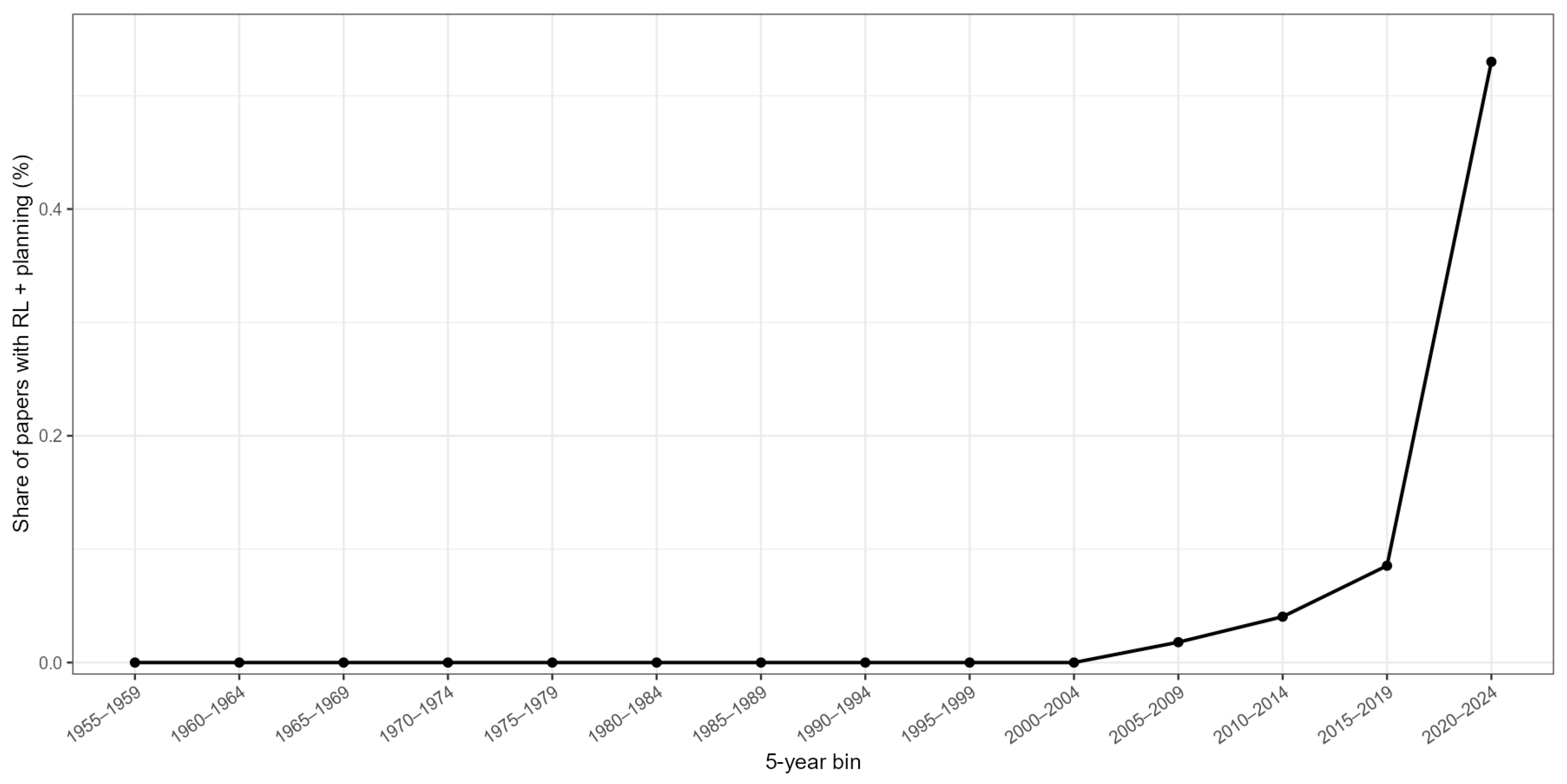 For the linkage analysis, only abstracts (excluding title text) were considered, and strict dictionaries were used to minimize false positives. Reinforcement learning (RL) studies were identified based on the terms “reinforcement learning” and “deep reinforcement learning”; terms consisting solely of abbreviations (e.g., PPO, DDPG, SAC) were not considered. With broader specifications (title + abstract, abbreviations allowed), the number of selected RL studies increases. This expansion slightly increases the proportion of articles dealing with communication and collaboration, but our main conclusions remain unchanged.