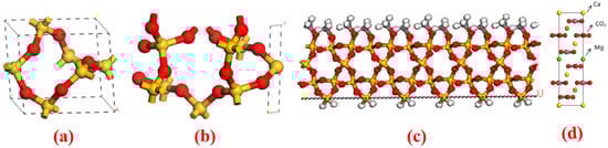 (a) Crystalline structure of quartz unit cell, Yellow represents Si atoms, red represents O atoms, white represents H atoms, and the dashed lines represent the crystal lattice; (b) quartz (1,0,0) cleavage plane model, Yellow represents Si atoms, red represents O atoms, white represents H atoms, and the dashed lines represent the crystal lattice; (c) lipophilic quartz (1,0,0) structural model, Yellow represents Si atoms, red represents O atoms, white represents H atoms, and the dashed lines represent the crystal lattice; (d) dolomite unit cell.