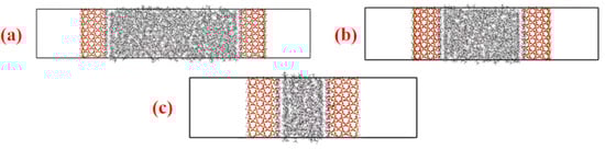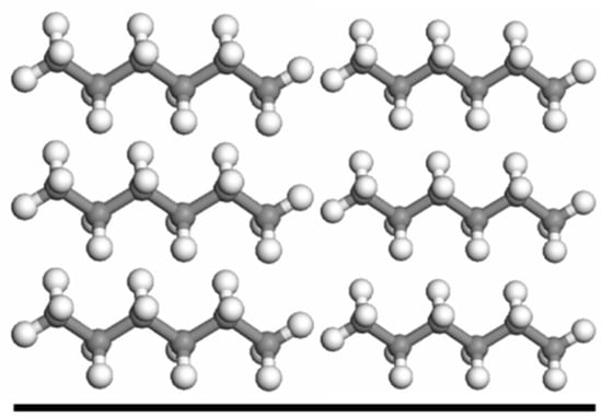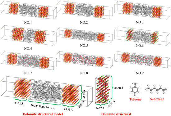 The use of these two molecules as rock surfaces has been widely validated [25,26,27,28]. N-hexane (C6) and toluene represent straight-chain alkanes and aromatic hydrocarbons, respectively. With 12 conformational degrees of freedom and no side-chain steric effects, C6 clearly demonstrates van der Waals interactions [29,30,31]. Toluene’s small molecular weight and well-established force field enable accurate reproduction of pore-scale alkane-aromatic distributions [32,33,34].