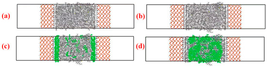 Figure 4 illustrates the dynamic evolution and component distribution characteristics of multicomponent crude oil within SiO2 slit pores. Homogeneous mixing of multicomponent crude oil in the pores is shown by the initial model (a), whereas system equilibrium is indicated by the final configuration (b) after 2000 ps simulation. In Figure 4c, aromatic hydrocarbons exhibit localized aggregation tendencies in the pores but are mostly adsorbed onto the siltstone surface. Conversely, Figure 4d demonstrates that n-hexane distributes relatively dispersedly, with higher concentration in the central pore region. Thus, under multicomponent conditions, stronger adsorption capacity for light hydrocarbon components is exhibited by siltstone, while heavy components form aggregates within the pores.