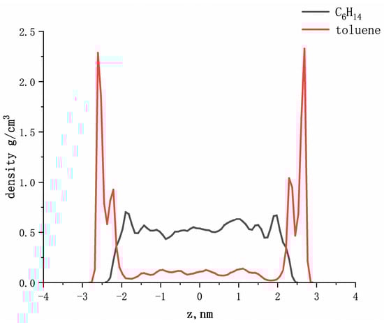Based on the above simulation snapshots, the density distribution of each component in the pores was calculated to further validate the distribution characteristics of each component (Figure 5). Aromatic hydrocarbons (toluene) exhibit two symmetric adsorption layers closest to the rock surface, with adsorption peaks located at ±2.61 nm and ±2.21 nm. Saturated hydrocarbons (n-hexane) show an adsorption peak at ±1.89 nm, forming a stable adsorption layer near aromatic hydrocarbons (toluene), which is consistent with the observations from the simulation snapshots.