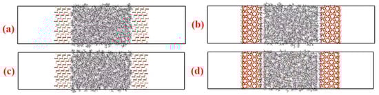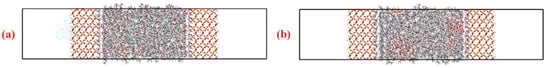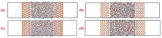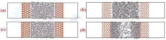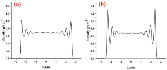 Figure 6 shows the simulation snapshots of the n-hexane/toluene-oil-wet SiO2 5 nm slit pore. As seen in Figure 6c, n-hexane maintains a relatively diffuse distribution state in the equilibrium model of oil-wet SiO2 5 nm pores. In contrast, Figure 6d shows significant structural rearrangement in the toluene equilibrium model, where molecules aggregated toward the pore walls. The density distribution in Figure 7 further corroborates this characteristic. Figure 7a indicates that although n-hexane exhibits density peaks near the pore walls (±2.61 nm), the curve fluctuates frequently and the density in the central region decays significantly. For toluene Figure 7b, higher-intensity density peaks form at the pore walls, and a “high-low-high” distribution trend is observed from the pore walls to the central pore region, indicating a higher enrichment degree near the pore walls and a more regular distribution pattern. These findings demonstrate distinct differences in the distribution of different crude oil components within oil-wet pores.