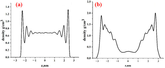 Figure 13 shows the density distribution of n-hexane along the Z-axis within dolomite and SiO2 pores. In both dolomite and SiO2 pores, n-hexane exhibits high-density peaks near the pore walls (z ≈ ±2.5 nm), with density fluctuations in the central region tending to stabilize. However, it can be clearly observed that the density of n-hexane near the dolomite surface is 1.12 g/cm3, whereas it is 1.31 g/cm3 near the SiO2 surface. Additionally, the density trough of n-hexane at z ≈ ±2.3 nm on the dolomite surface is significantly lower than that on the SiO2 surface.