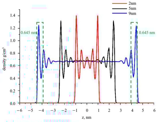 Within different-sized pores, molecular translational and rotational degrees of freedom are restricted by spatial confinement. In nanoscale slit pores, crude oil component molecules cannot diffuse freely and are forced to adapt to the pore space morphology, leading to enhanced molecular alignment order and the distribution of layered distribution or oriented adsorption phenomena [47,48,49,50,51]. Taking n-hexane with moderate adsorption properties as an example, the distribution state of crude oil components under confinement effects is investigated.