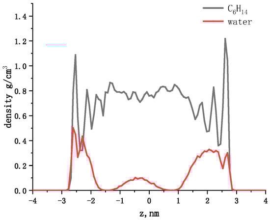 Density distribution curves of n-hexane and H2O in oil-wet SiO2 pores.