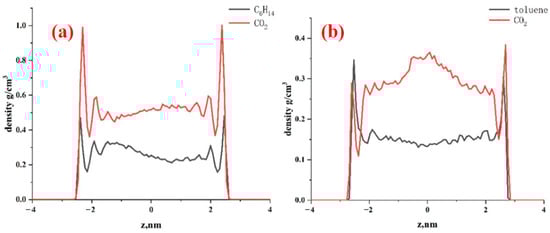Density distribution of multicomponent with CO2 in 5 nm oil-wet SiO2 pores. (a) n-hexane; (b) toluene.