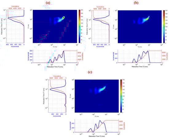Nuclear magnetic resonance (NMR) spectroscopy was used to analyze the distribution state of crude oil in oil-saturated core pores. Figure 18 shows T1–T2 NMR plots of natural cores at different stages. The horizontal axis (T2) reflects pore size: longer axes indicate larger pores, shorter axes smaller pores. The vertical axis (T1) represents fluid-rock surface interactions: longer axes signify weaker interactions, shorter axes stronger interactions. Color intensity denotes fluid signal strength, i.e., crude oil component content in pores. D2O was added to deionized water to enhance displacing fluid signals, leveraging the 1H nuclear properties to distinguish hydrogen in crude oil from that in displacing fluids via differential signal amplitudes. Figure 18 displays hydrogen signals from crude oil, enabling quantification of residual oil content across pore sizes.