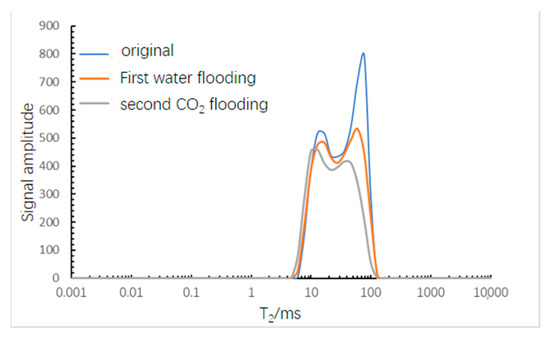 After compiling the T2 signal intensities at different stages, Figure 19 is obtained. The curve exhibits the highest peak concentrated in the high-T2 interval (10–100 ms), indicating that oil in the original core is primarily in a free state within large pores. The high hydrogen proton content and relaxation characteristics correspond to the strongest signal amplitude. Following water flooding, the peak amplitude decreases, and the high-T2 interval signal attenuates significantly. As water displaces free oil in large pores, remaining oil mainly exists as capillary-bound oil in small pores or residual oil, leading to an overall reduction in signal intensity. This reflects the effective displacement of large-pore oil by water flooding but highlights its limited ability to mobilize remaining oil in small pores.