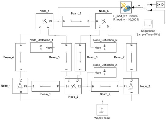 The truss system defined as Model 1.2, constructed in Simscape Multibody, features the same block configuration as shown in Figure 2. The only distinction lies in the implementation of the nodes.