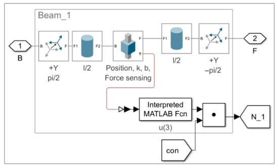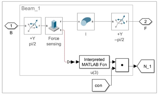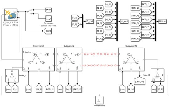 The subsystem of the truss bar, based on the Euler–Bernoulli beam model, is analogous to that used in Model 1.1 and Model 1.2 (see Figure 3). The same modeling principles apply. All truss bars in the simulation are structurally identical, and only axial force is considered.