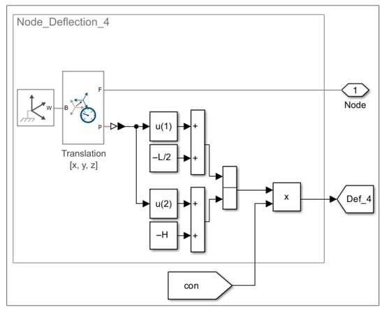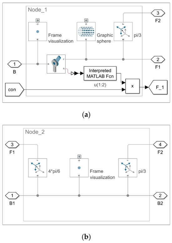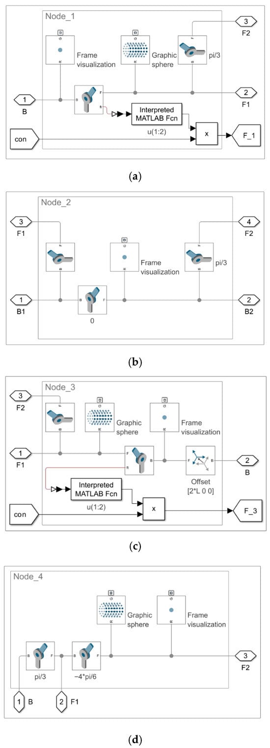 The block configuration of Model 2.2, constructed in Simscape Multibody, is identical to the configuration shown in Figure 10. The only difference lies in the implementation of the nodes.