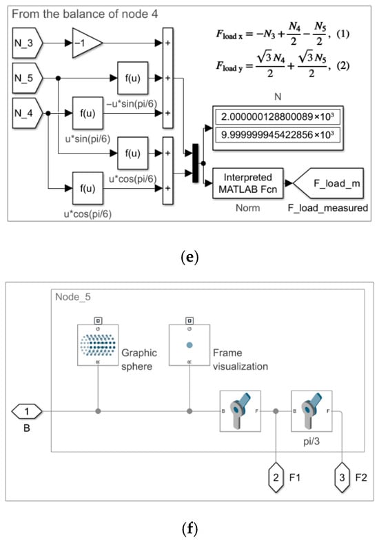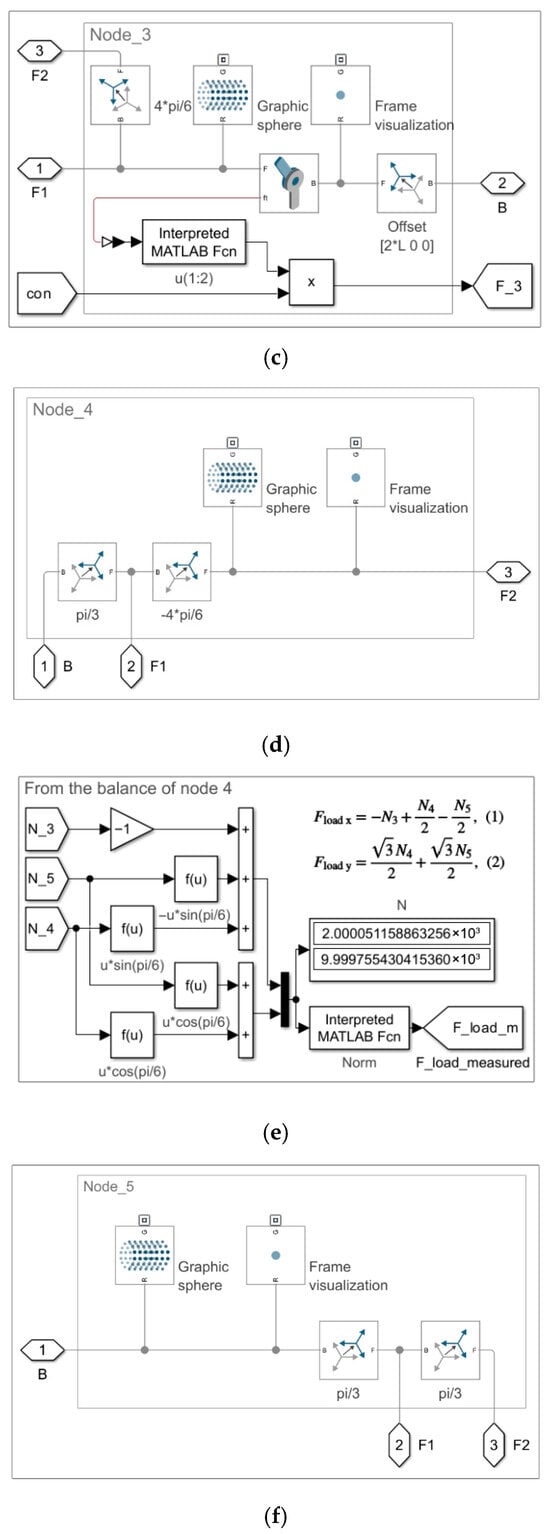 Model 1.2. Subsystems by node: (a) Node_1; (b) Node_2; (c) Node_3; (d) Node_4; (e) measurement of the Fload m force at Node_4; (f) Node_5.