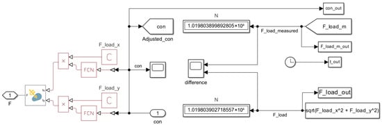 Figure 8 presents the subsystem responsible for applying the external load Fload, including its proportional correction via a multiplication constant con. This configuration is identical across all models (Model 1.1, Model 1.2, and Model 1.3).