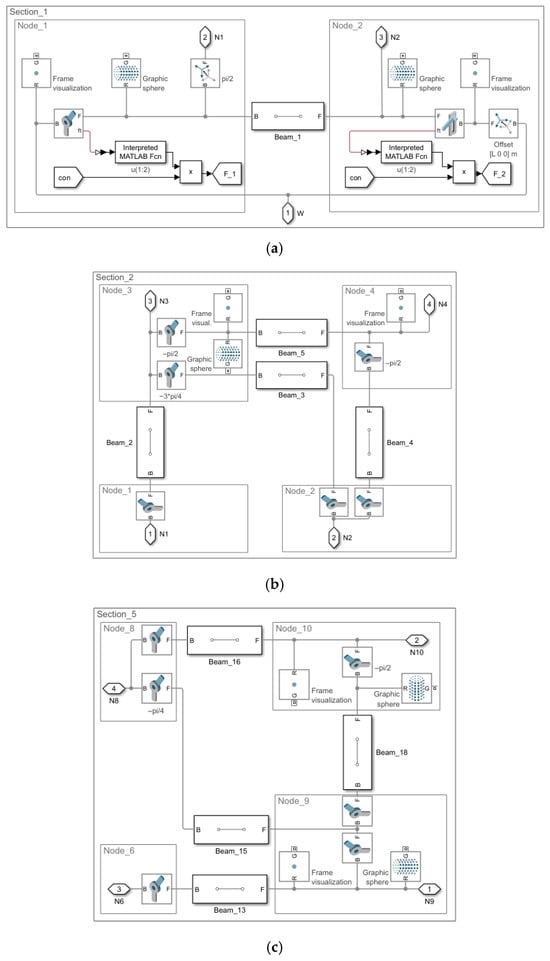 Model 2.1 and Model 2.3. Subsystem types by section: (a) Section_1; (b) Sections_2 to _4 are conceptually identical; (c) Sections_5 to _6 are conceptually identical.