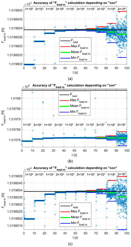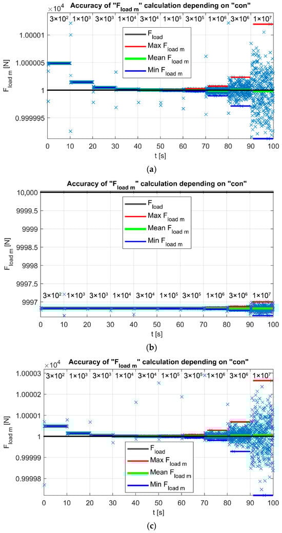 The results are subsequently visualized in the plot F_load_m = function(con), as shown in Figure 14, Figure 15 and Figure 16. The closer the value of F_load_m is to the applied force F_load, the more accurate the computation is, provided that the variation in F_load_m remains minimal. If the variation in F_load_m exceeds the maximum and minimum values observed in the preceding sequence, the resulting error may increase (depending on the sample). In such cases, it is not meaningful to proceed with the computation.