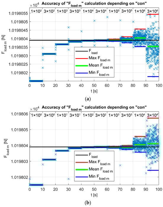 During simulations in Simulink and Simscape models, certain differences in computational accuracy arise when the levels of input quantities are varied. These differences can naturally be addressed in “Model Settings–Solver” [19] (pp. 311–319) or the online aid [28] by imposing stricter requirements on parameters such as “Max step size”, “Absolute tolerance”, and “Relative tolerance”, either with respect to zero or relative to previous iterations. For the computations involving the given truss systems, where a static problem was analyzed, the recommended solvers ode15s, ode23s, ode23t, and ode23tb were used for so-called stiff problems. These solvers exhibit significantly higher speed compared to methods designed for nonstiff problems, such as ode45, ode23, or ode113. Another interesting approach that can be taken to further improve computational accuracy involves adjusting the proportionality (scaling) of the input quantity in the system, whether the system under analysis is a static structure, as in our case, or another type of system. Based on this proportionality, it is sufficient to identify a known quantity within the system (in our case, Fload) and redefine it based on the computational outputs (i.e., Fload m). For the simplest evaluation of output quantities, we opted for implementing step changes in proportionality using the multiplier constant con within individual sequences. Data representing steady-state values were isolated using a time Lag and Lead to exclude transient responses, which would otherwise distort the output value of Fload m. Figure 14, Figure 15 and Figure 16 clearly demonstrate that the accuracy of the computation varies depending on the level of the load force Fload. The optimum is achieved when the mean value of Fload m closely matches Fload while maintaining minimal swing. For example, if, for a given sequence k, the mean value of Fload m is closer to Fload, but the swing is large enough to extend into the mean calculated in sequence (k−1), then the probability of the calculation being accurate is not 100%. We observed that this proportionality cannot be easily generalized for all systems. It depends on numerous parameters of the system. If parameters such as the diameter of the bars or the Young’s modulus are altered, the optimal setting for the computation also changes. Regarding damping, the coefficients were selected to be the minimum necessary. For bars subjected to Rayleigh damping, the default values of bm and bk were retained, as they can essentially be nearly negligible. This is because very small increments of deformation are considered, which are proportionally scaled. In the case of solid bars, the damping coefficient b and the damping of supports brj were only increased to the level necessary to suppress undesirable transient responses during the computation.