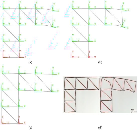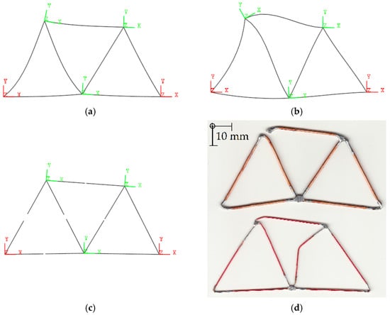 Visualization of the deformed state was performed for a specified norm of the displacement vector, ||δ11|| = 0.1 m, at Node_11 (see, e.g., Figure 9). This value is not critical and serves solely to exaggerate the deformation in the theoretical models for illustrative purposes. For the physical structure, copper (Cu) was selected as the material due to its favorable ductility and plasticity. The diameters of the bars were kept constant within each sample, with values of da = 1.4∙10−3 m and db = 1∙10−3 m. The dimensions were set as H = 40∙10−3 m and L = 40∙10−3 m. The model was constructed exclusively as a test for excessive deformation. In the theoretical models, the material was not changed, as this had no impact on the resulting deformed shape.
