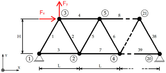 Example 3. Schematic of the truss system structure subjected to the force vector Fload at Node_3, comprising 39 bars and 21 nodes.