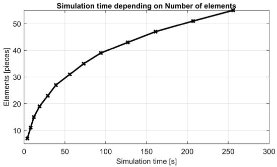 The examples are divided into models that differ in their types of nodes and bars. The aim was to assess their influence on static analysis and the visualization of deformation. The models constructed from Euler–Bernoulli beams or from solid bars with one degree of freedom (1 DOF) and joints delivered the best results when compared with the theoretical model, as shown in Table 1, Table 2 and Table 3. However, it should be noted that models with solid bars and one DOF are generally unsuitable for dynamic simulations due to the non-uniform distribution of mass elements along the length of the bar. Models using locked joints may, in some cases (such as welded joints), reflect physical reality, but they show lower agreement with the theoretical model. This discrepancy arises because the direction of internal forces in the bars changes during deformation, a behavior that conventional joints can accommodate. For visualizing deformation, physical structures composed of copper elements were deliberately created due to copper’s excellent ductility (see Figure 17d and Figure 18d). These structures were deformed between two holding plates to prevent undesired buckling along the z–axis. Models 1.3 and 2.3 (see Figure 17c and Figure 18c) exhibited the fastest computations and provided a good approximation of the deformed shape. The time required for the calculation depends on the number of system elements. See Figure 22.