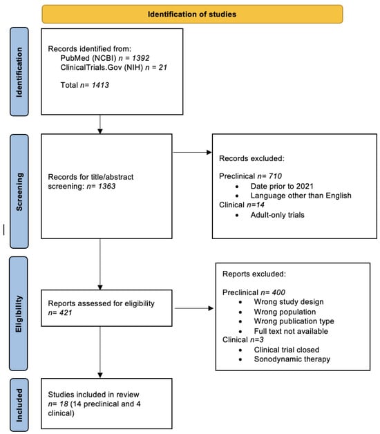 A scoping review was performed in accordance with the Preferred Reporting Items for Systematic Reviews and Meta-Analyses Extension for Scoping Reviews (PRISMA-ScR) guidelines (Figure 2). To evaluate past and present preclinical studies regarding focused ultrasound, a comprehensive literature review was conducted using publications retrieved from PubMed using the keywords “low-intensity focused ultrasound”, “pediatric DIPG focused ultrasound” and “LIFU DMG”. Articles included peer-reviewed original research and technical reports regarding experiments which examined FUS-mediated BBB disruption in DIPG/DMG animal models during the time period 2021–2025. A systematic review was also performed of active clinical studies from clinicaltrials.gov. Clinical trials that were excluded were those involving sonodynamic therapy as the focus of this review was low-intensity focused ultrasound. Subsequent investigation of any notable results of these trials thus far was ascertained through further PubMed search individualized to each NCT identification number.