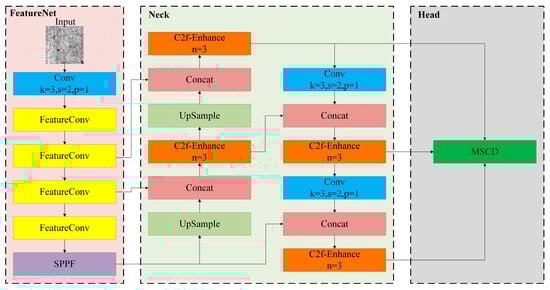 The network architecture of the FEM-YOLO algorithm proposed in this paper is shown in Figure 1. Its backbone network is designed as FeatureNet, which significantly saves computing resources and reduces the number of parameters. Moreover, the designed EnhanceConv is integrated into the C2f module, which further saves computing resources and reduces the number of parameters. In addition, a lightweight shared convolution detection head (MSCD) is designed in the algorithm head. By minimizing the number of parameters and computational load, it improves the operation speed while maintaining high detection accuracy.