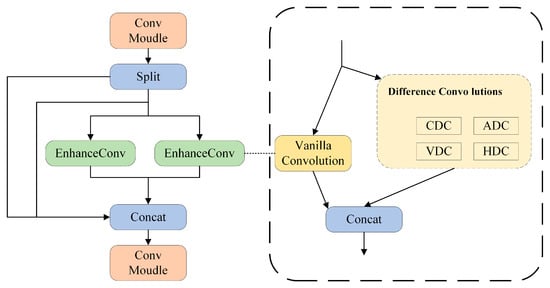 To address the aforementioned issues, this paper proposes the C2f-Enhance module, as shown in Figure 4. Inspired by the DEA-Net (Image Dehazing Network) proposed in Reference [30], the C2f module is improved by introducing Enhanced Convolution (EnhanceConv) to replace traditional convolution, thereby enhancing the edge information extraction capability and reducing parameter complexity. The C2f-Enhance module splits the input features into two parts: one part is directly output through a skip connection, and the other part undergoes the EnhanceConv operation. EnhanceConv combines traditional convolution and Difference Convolution to enhance high-frequency information (such as edges and contours), which is conducive to more accurate defect identification.