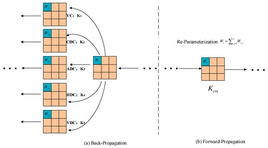 Among them, EnhanceConv() denotes the EnhanceConv convolution operation proposed in this paper. Ki, where i = 1–5, respectively, represent the kernels of VC (Vertical Convolution), CDC (Central Difference Convolution), ADC (Angular Difference Convolution), HDC (Horizontal Difference Convolution), and VDC (Vertical Difference Convolution), denotes the convolution operation; and Kcvt denotes the converted kernel, which merges the parallel convolutions together. The process of the reparameterization technology is shown in Figure 5.