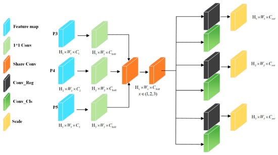To address the aforementioned issues, this paper proposes MSCD, which aims to improve the algorithm’s operating efficiency by reducing the number of parameters and computational overhead while maintaining high detection accuracy. The structural design of MSCD is shown in Figure 6. After the feature extraction network outputs three feature layers, each branch first performs channel adjustment through a 1 × 1 convolutional layer, unifying the number of channels of the three input feature layers to the intermediate channel number A. Subsequently, all feature layers are integrated into a shared convolution module for feature extraction, and 3 × 3 convolution kernels are adopted to reduce parameter and computational requirements. In the final branch, the regression and classification tasks are processed independently: the regression branch predicts the bounding box coordinate offsets through a 1 × 1 convolutional layer, and to address the localization problem caused by target scale differences among different detection heads, a scale adjustment layer is introduced to adapt to defects of different sizes. The classification branch predicts the probability of each category through a 1 × 1 convolutional layer. It is worth noting that the weights of the convolutional layers in the regression and classification branches are independent, which enables the algorithm to optimize the localization and classification tasks separately.