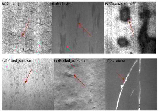 Sample of surface defects on strip steel. (a) Cr. (b) In. (c) Pa. (d) Ps. (e) Rs. (f) Sc.