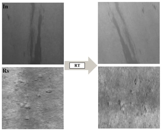 The Albumentations library is employed to implement these augmentation operations, with all transformations tailored to the practical scenarios of steel strip defects, ensuring that the transformed images retain the essential characteristics of the defects. Through this data augmentation approach, the extended dataset significantly enhances the performance of the model. Augmented data are generated using defects such as Inclusions (In) and Rolled-in Scale (Rs) as examples, as shown in Figure 8.