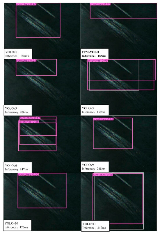 These studies have made progress in lightweight computation-intensive object detection algorithms and provided valuable insights for this field. However, in the field of steel strip surface defect detection, the computing capacity of terminal detection devices is usually only a few GFLOPS, with memory less than 8 GB. In contrast, the computational load of mainstream object detection algorithms (such as the YOLO series) is generally between 40 and 150 GFLOPS, and the prediction for 1024 × 1024 images requires approximately 16 GB of memory. Such computational requirements exceed the processing capacity of terminal detection devices, hindering the stable operation of large-scale object detection algorithms. To address such issues, in order to achieve a lightweight algorithm while ensuring the accuracy of the detection algorithm, this paper conducts lightweight improvement using the more advanced YOLOv8n algorithm in the YOLO series and proposes the Finite Element Method-YOLO (FEM-YOLO) network algorithm, as shown in Figure 1. The main contributions of this paper include: