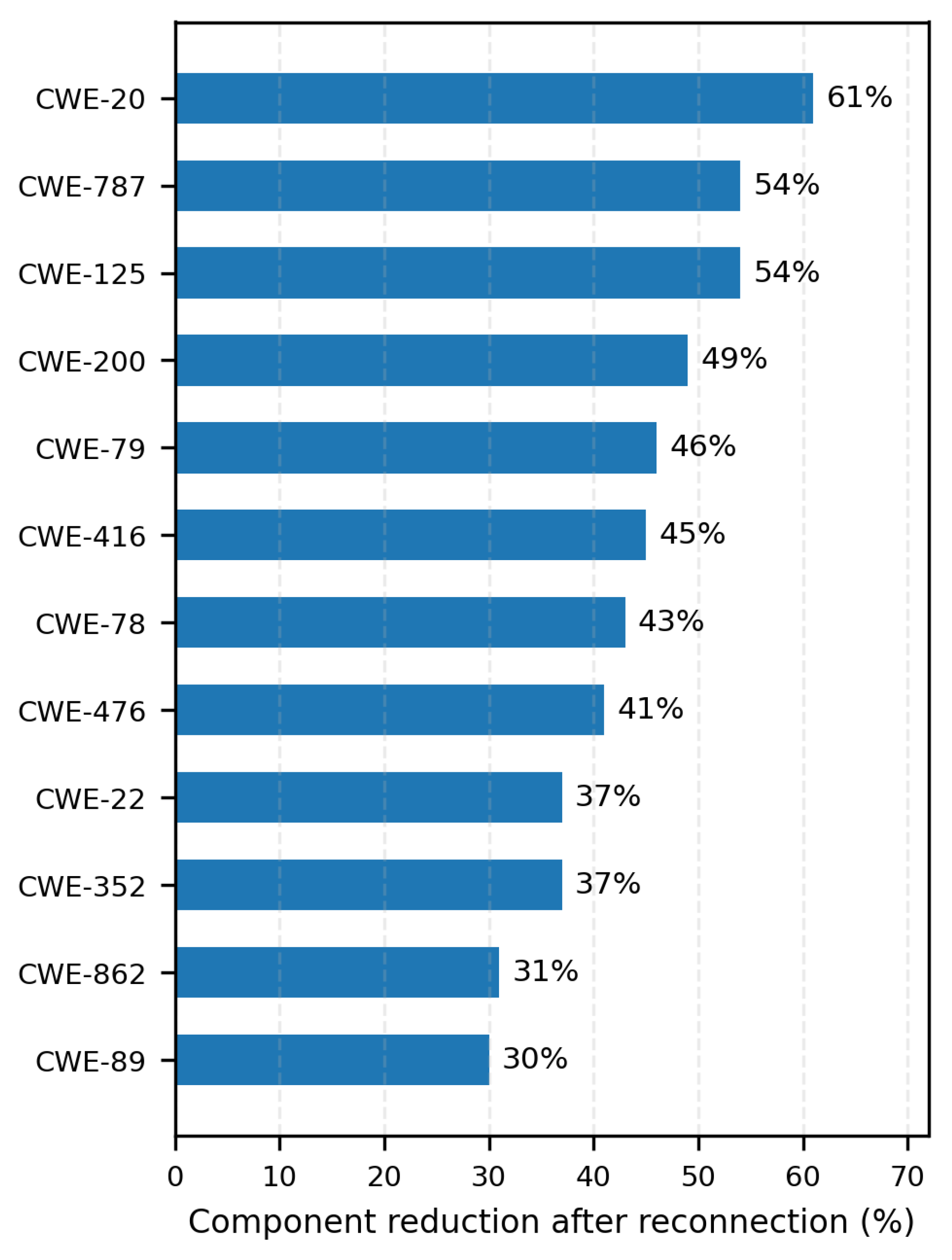 - Signal: Large LCC growth factor after diagnostic reconnection (e.g., CWE-78: 4.29×, CWE-79: 3.56×) → Action: expect cross-product coupling; harden shared execution/path modules before broad rollout.