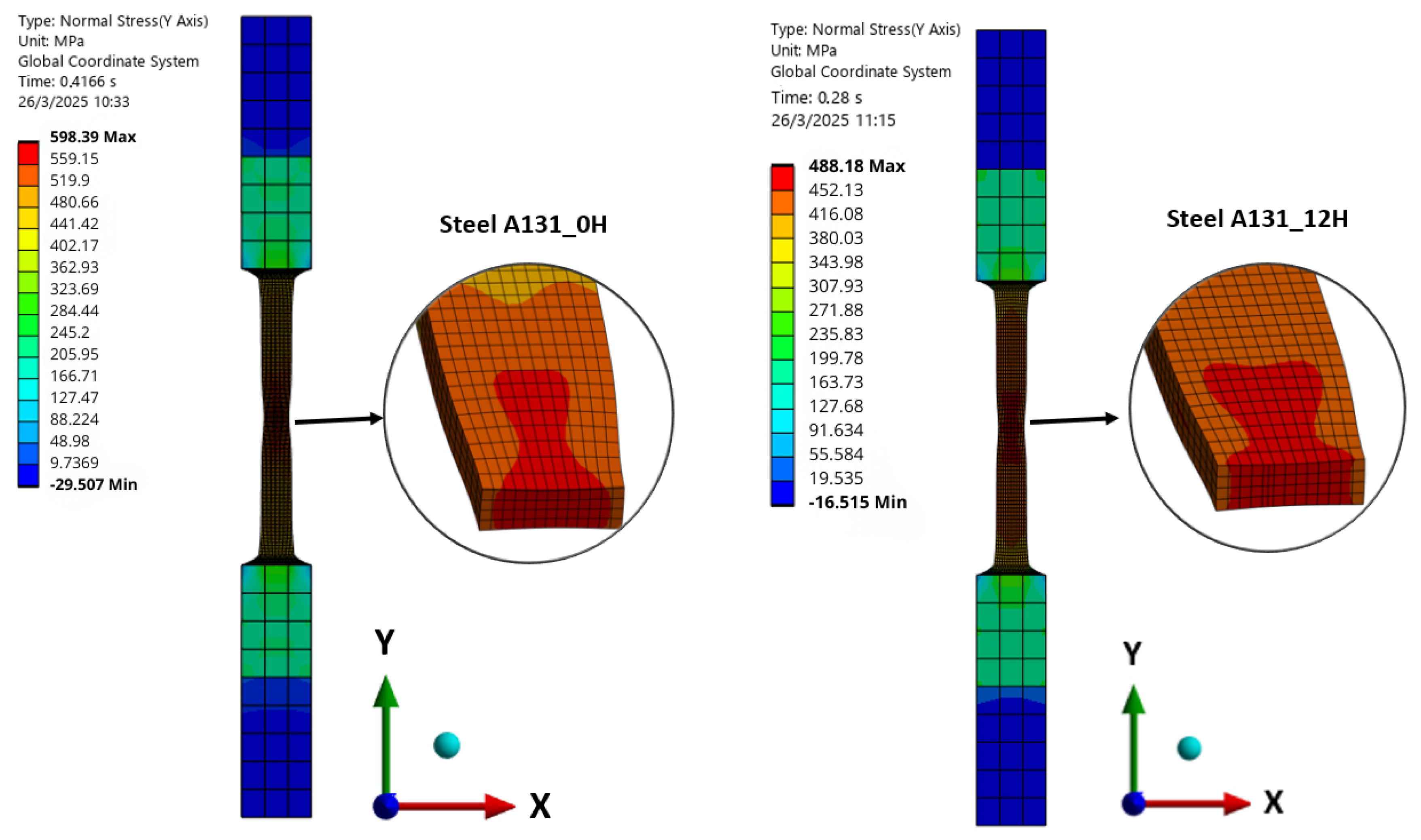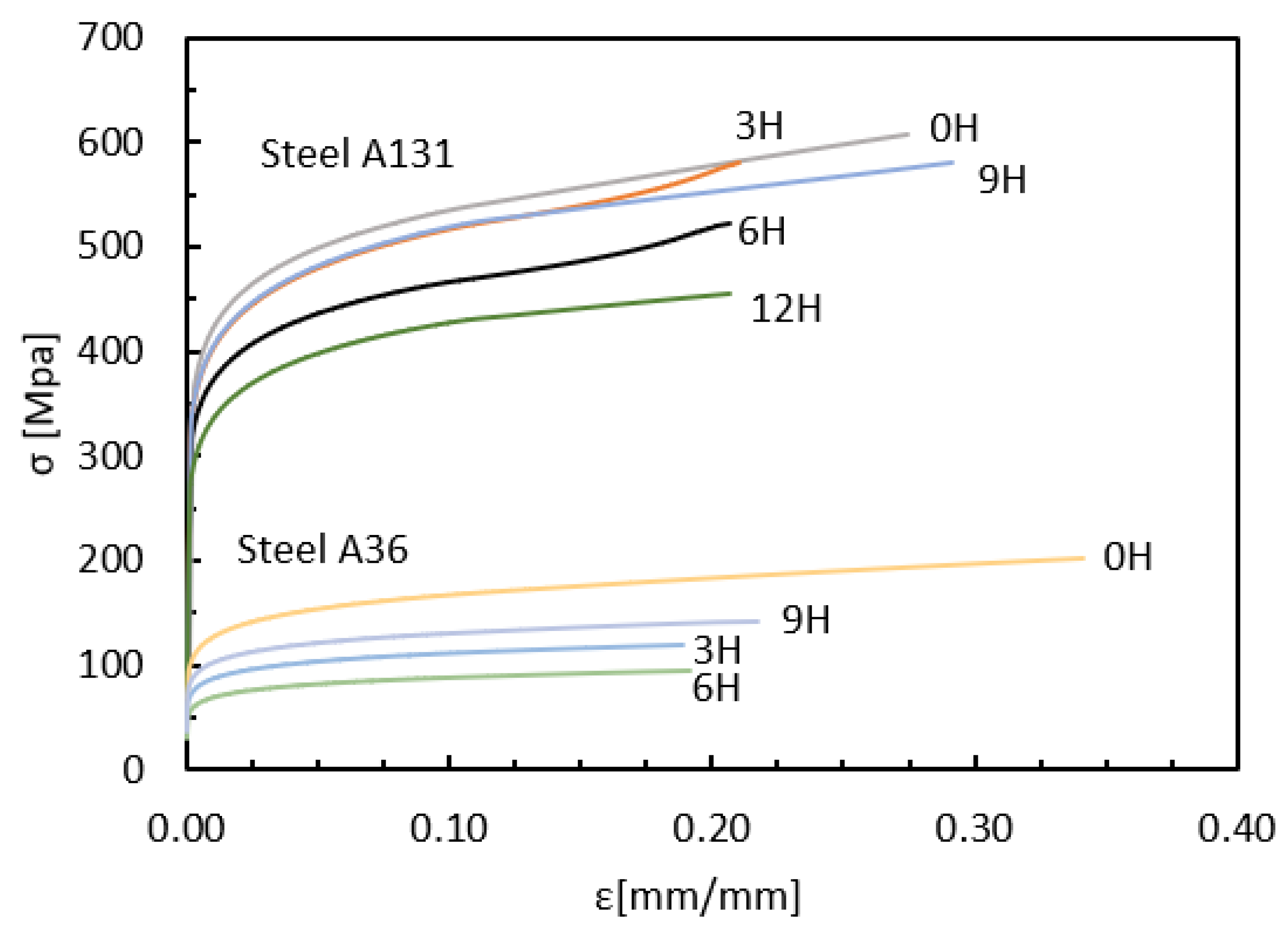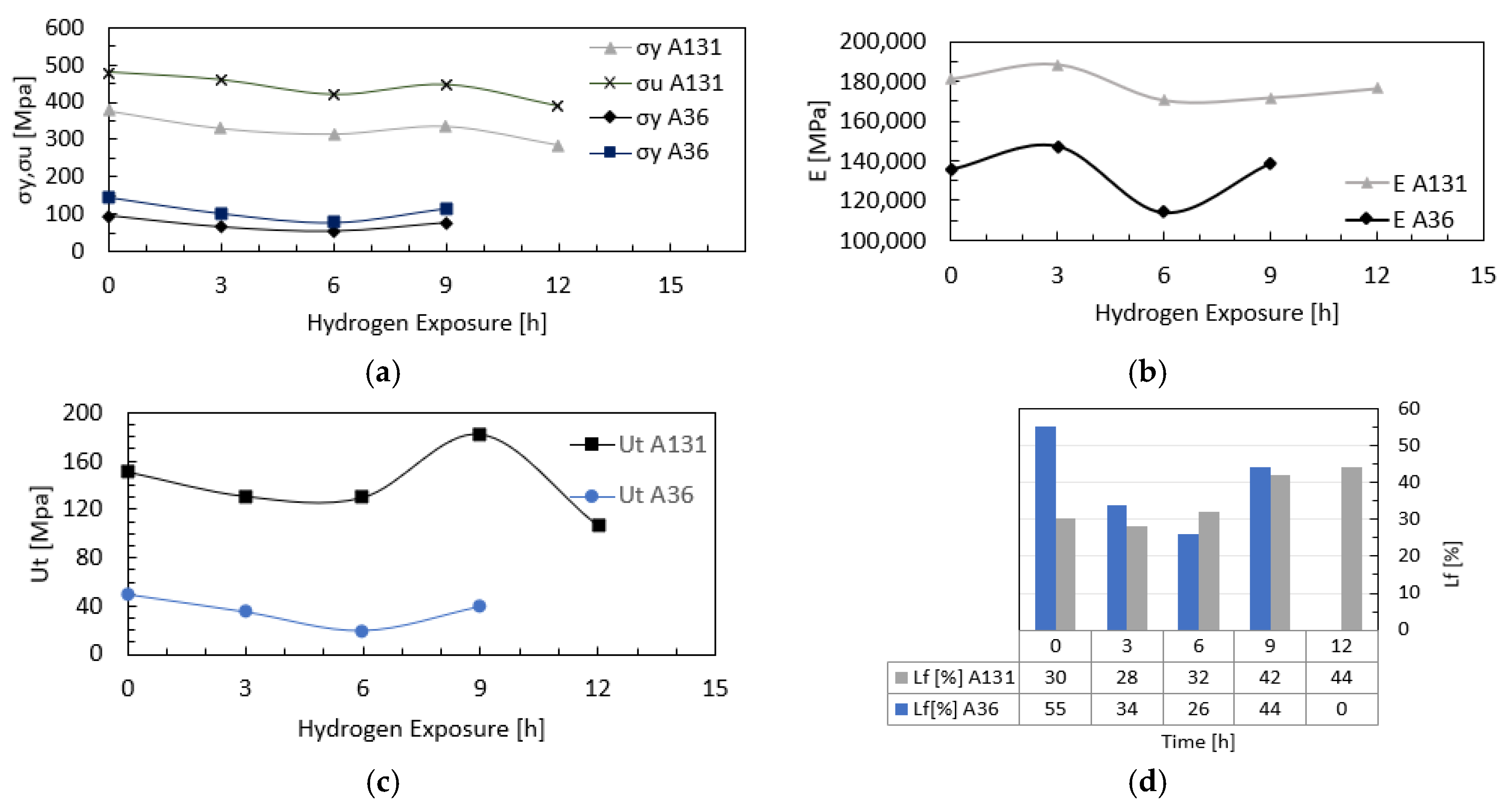 - Mechanical degradation: Both steels showed progressive reductions in strength and toughness after 6 h of hydrogen exposure. A transient hardening occurred at 9 h, but long-term properties declined. Maximum reductions in ultimate tensile strength were 19% (A131) and 47% (A36), with toughness decreasing by 39% and 61%, respectively.