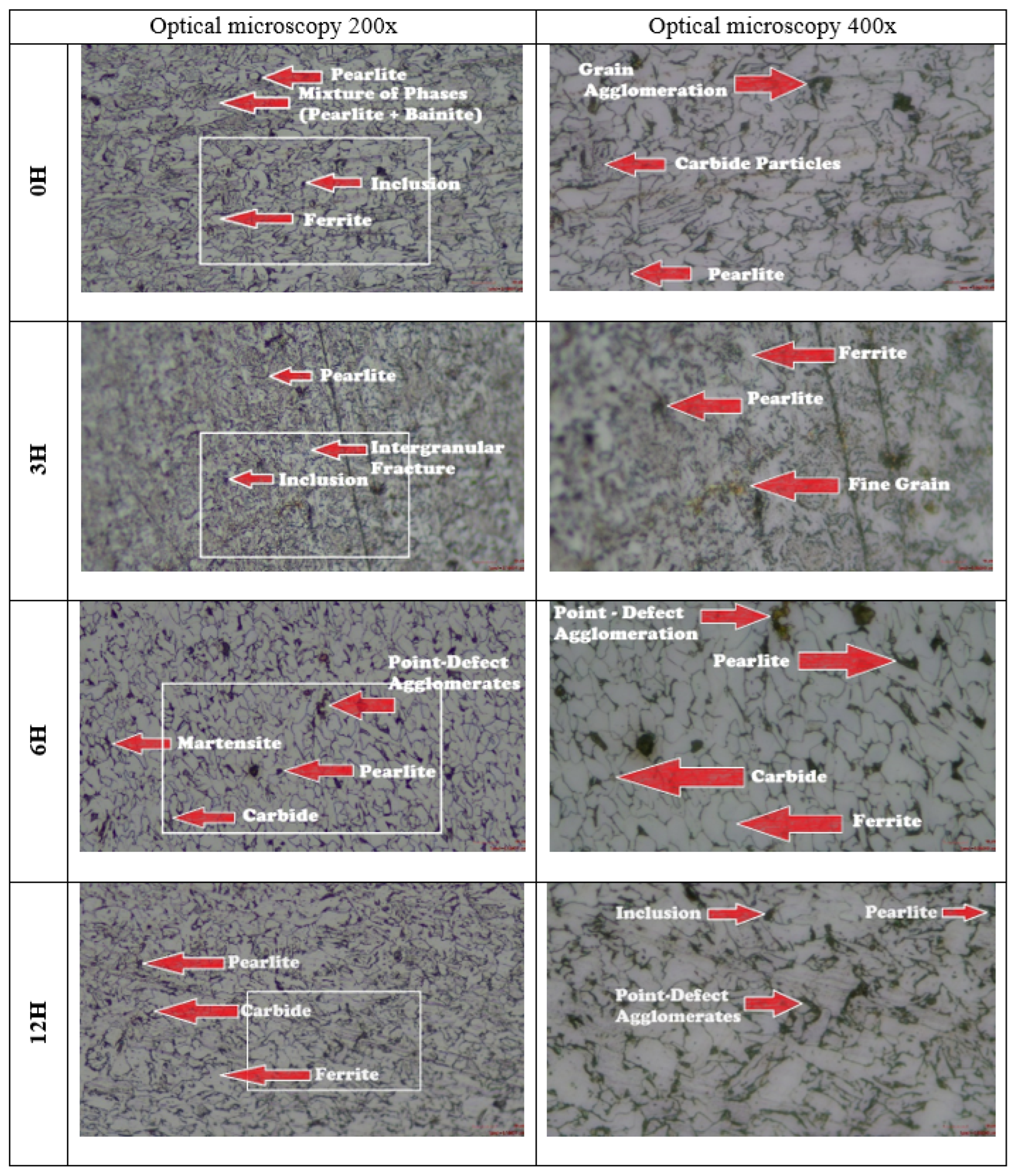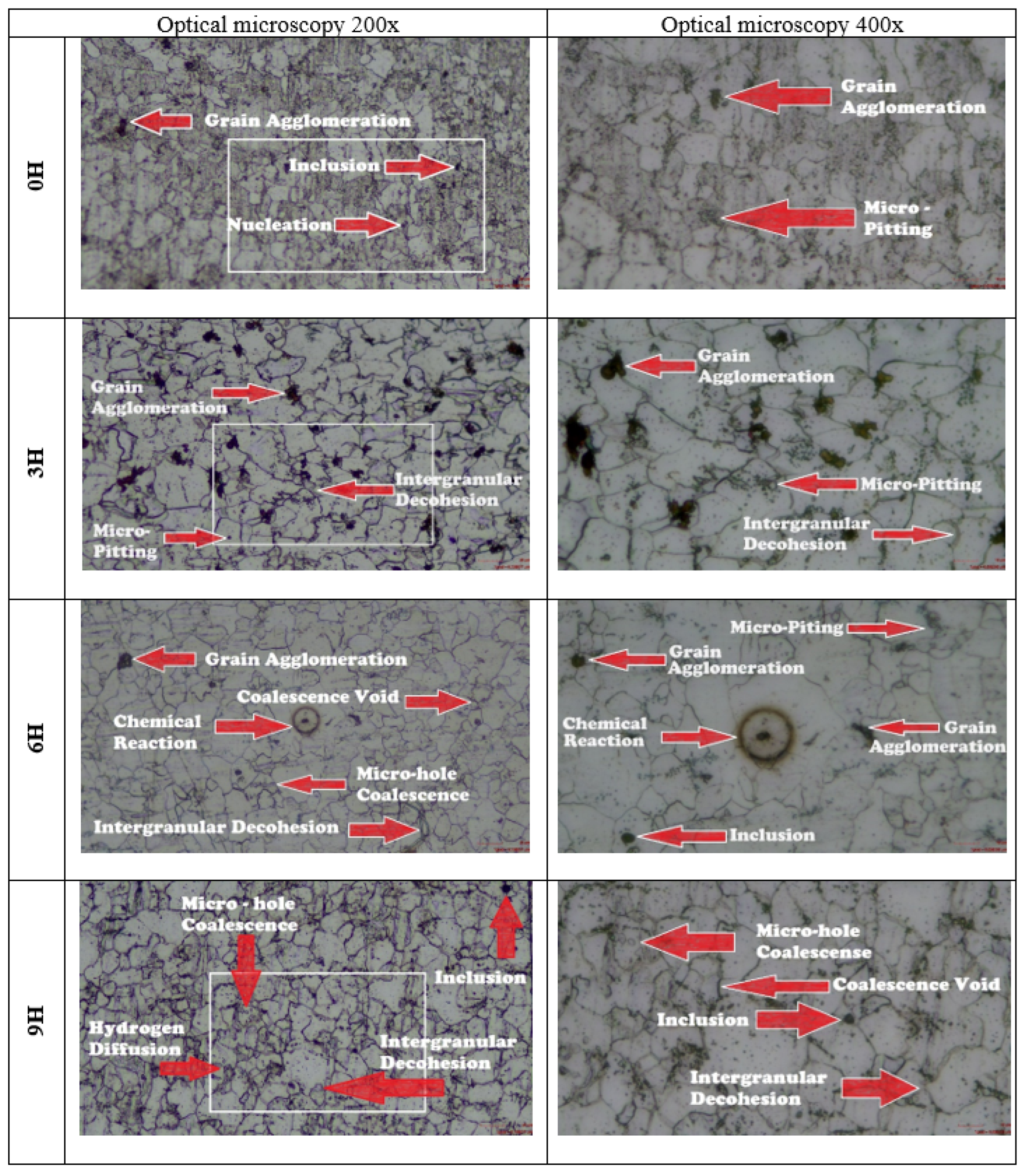 - Microstructural damage: Hydrogen embrittlement produced inclusions, intergranular decohesion, cracks, micro-pitting, and fissures, increasingly severe with longer exposure.