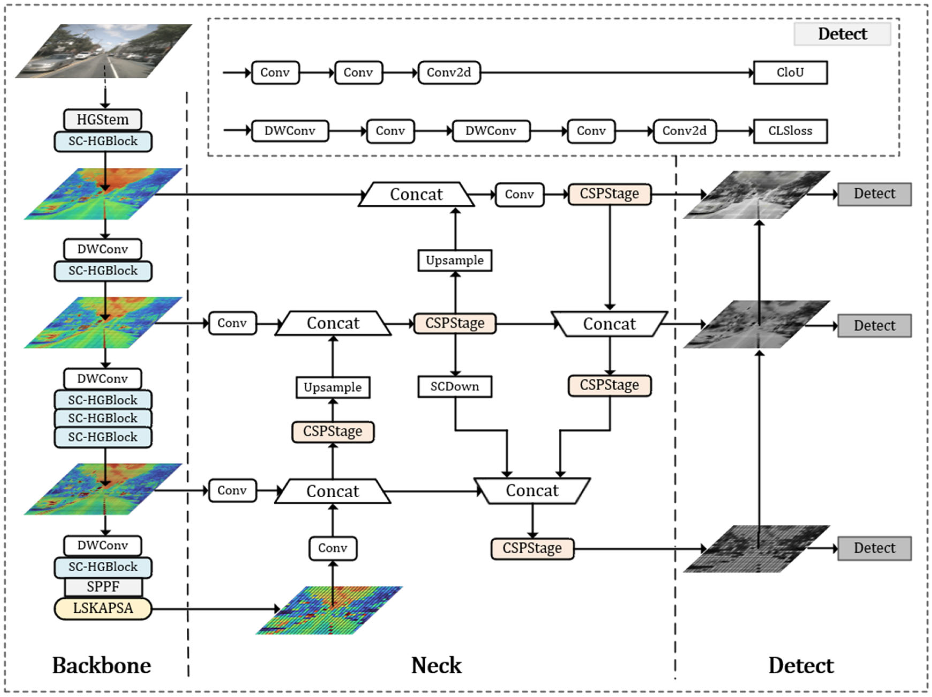 Progress in deep neural network technology has significantly advanced the domain of road object detection. Neural network-based object detection techniques are typically classified into two primary categories: two-stage and single-stage methods. In two-stage object detection, the R-CNN series [2] (including Fast R-CNN [3] and Faster R-CNN [4]) employs selective search techniques to extract candidate regions, followed by convolutional neural networks (CNNs) for feature extraction, ultimately performing target classification and regression. These algorithms typically meet high-accuracy requirements but are less suitable for scenarios involving video stream data processing. In contrast, single-stage detection networks, such as SSD [5] and the YOLO series [6,7,8], simultaneously predict target categories and bounding box coordinates on convolutional feature maps, offering efficient real-time processing speeds, particularly suitable for dynamic video stream scenarios. Ghita et al. [9] compared the improvements of YOLOv5 to YOLOv9 in road environment object detection. Zhu et al. [10] proposed a vehicle detection model based on an improved YOLOv5, incorporating a coordinate attention mechanism to enhance the recognition rate of vehicle targets in dense object scenarios and introducing full-dimensional dynamic convolution to implement a multidimensional attention mechanism for improved feature extraction. Jiao et al. [11] proposed an improved YOLOv8s algorithm for road object detection, introducing a multi-scale path aggregation feature pyramid network to enhance the representation and perception capabilities of semantic features at different levels. They also adopted a weighted shuffle fusion algorithm to improve interlayer feature interaction and intralayer feature adjustment capabilities. Zhang et al. [12] proposed an improved YOLOv11s algorithm for road object detection, incorporating a global edge information transmission module to transfer edge information extracted from shallow layers to the model for fusion with features at different scales, and employing layer-adaptive amplitude-based pruning to remove redundant parameters. Gong et al. [13] addressed the challenge of small target detection by using an adaptive frequency-domain aggregation module to dynamically aggregate features, improving the frequency distribution of small object images while reducing computational costs through channel dimension compression. Zhao et al. [14] introduced the Real-Time Detection Transformer (RT-DETR), designing an efficient hybrid encoder that decouples intra-scale interactions and cross-scale fusion to rapidly process multi-scale features, thereby improving speed. They also proposed an uncertainty-minimized query selection to provide high-quality initial queries for the decoder, enhancing accuracy.