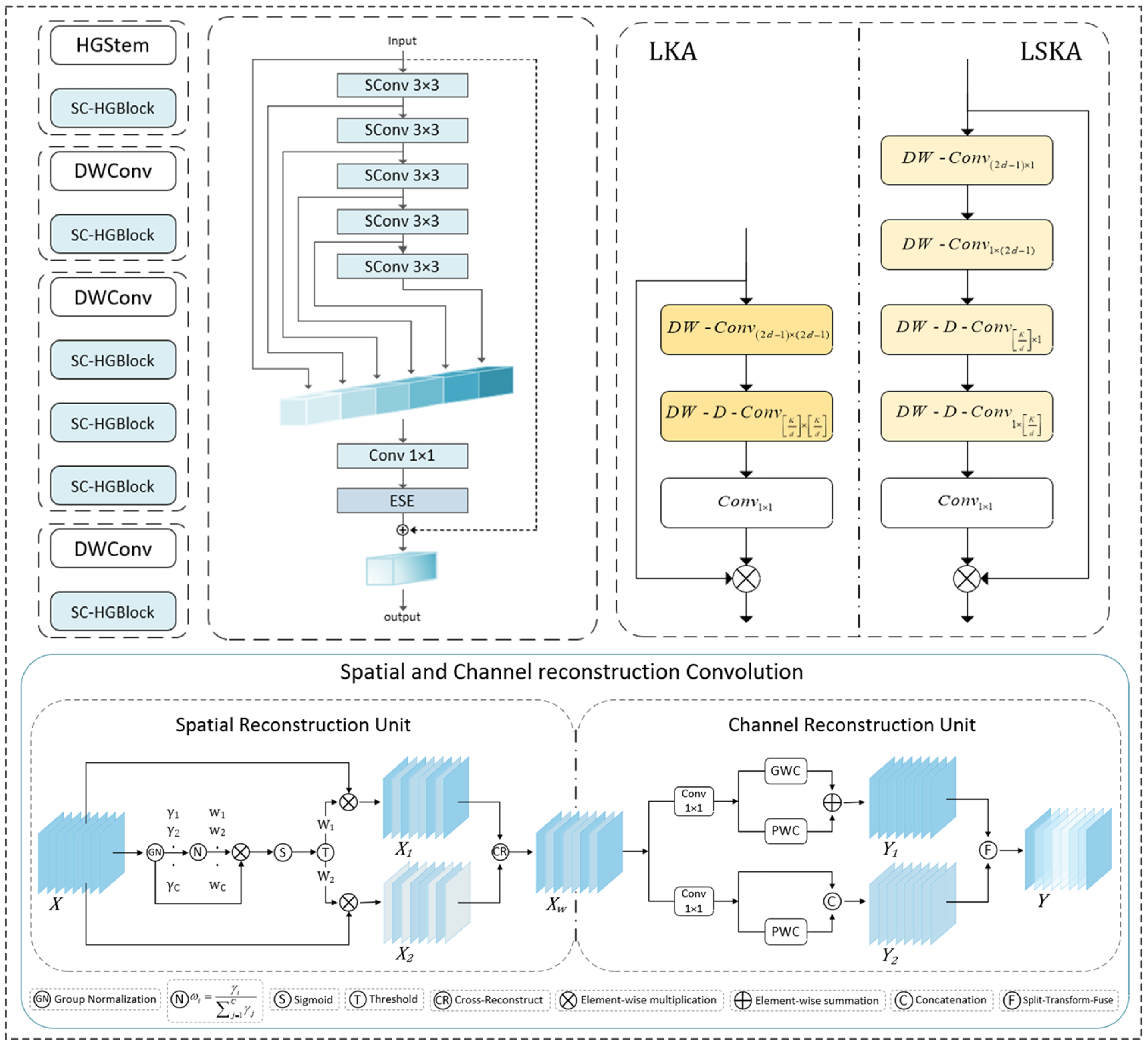 Figure 2. (Top-left) SC-HGNetv2 and its SC-HGBlock structure; (Top-right) LKA and LSKA structures; (Bottom) SCConv structure.
