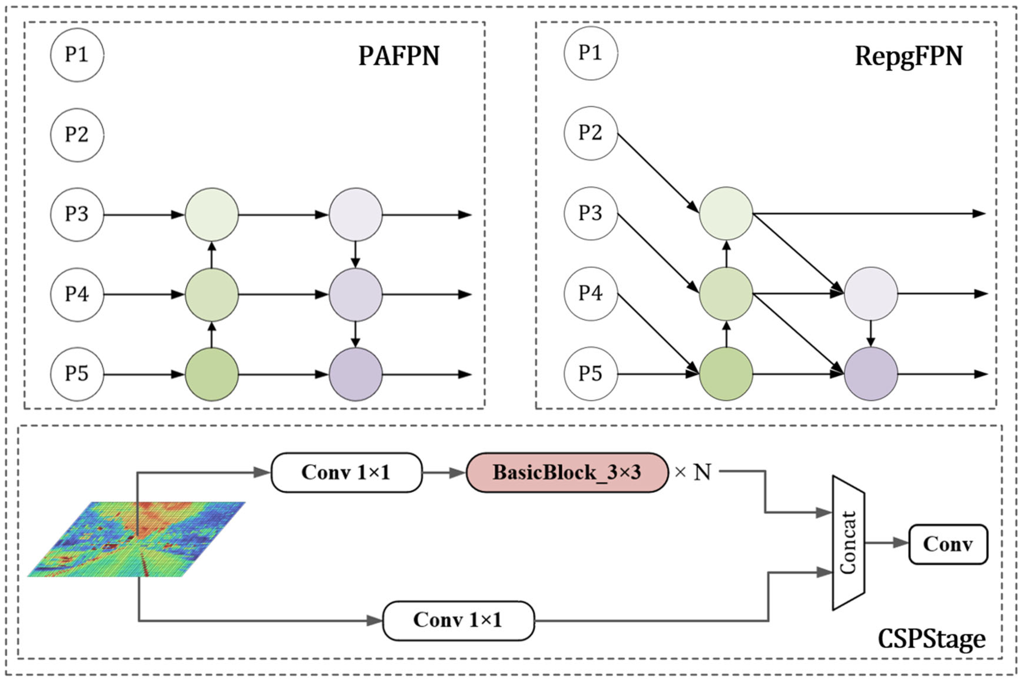 Finally, RepGFPN is introduced as the feature fusion layer to optimize information flow across different scales. Through structural reparameterization, multi-branch structures are merged during inference, enhancing the efficiency of multi-scale feature fusion. This facilitates the network’s more effective interchange of abstract semantic representations and fine-grained spatial information, thereby substantially enhancing detection accuracy while introducing only a negligible increase in computational overhead.