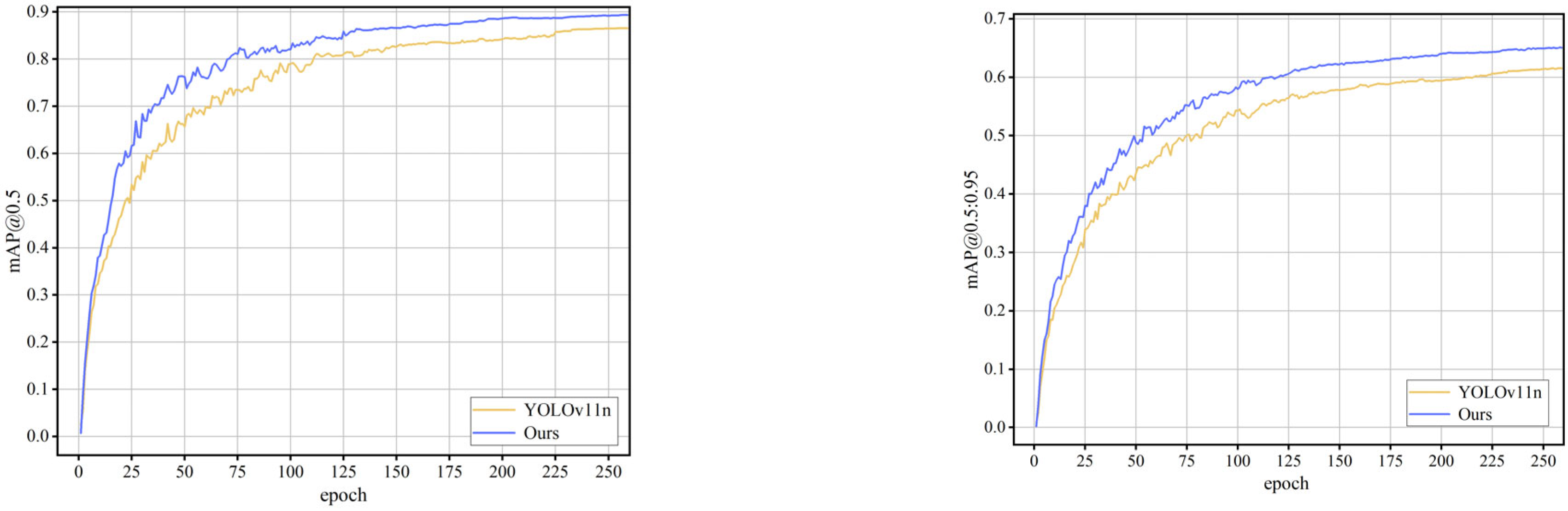 The alterations in mAP0.5 and mAP0.5:0.95 values for the enhanced model and the baseline model over 260 training epochs are represented in the form of a line chart, as illustrated in Figure 4. During the initial ten training epochs, the discrepancy in accuracy between the enhanced and the baseline models is found to be negligible. However, as training progresses, the enhanced model demonstrates a marked improvement in performance, outperforming the baseline model in both mAP and mAP50:95 metrics. Following the convergence process, the enhanced algorithm exhibited substantial enhancements in its performance. This finding serves to substantiate the scientific robustness and efficacy of the proposed enhancement method.