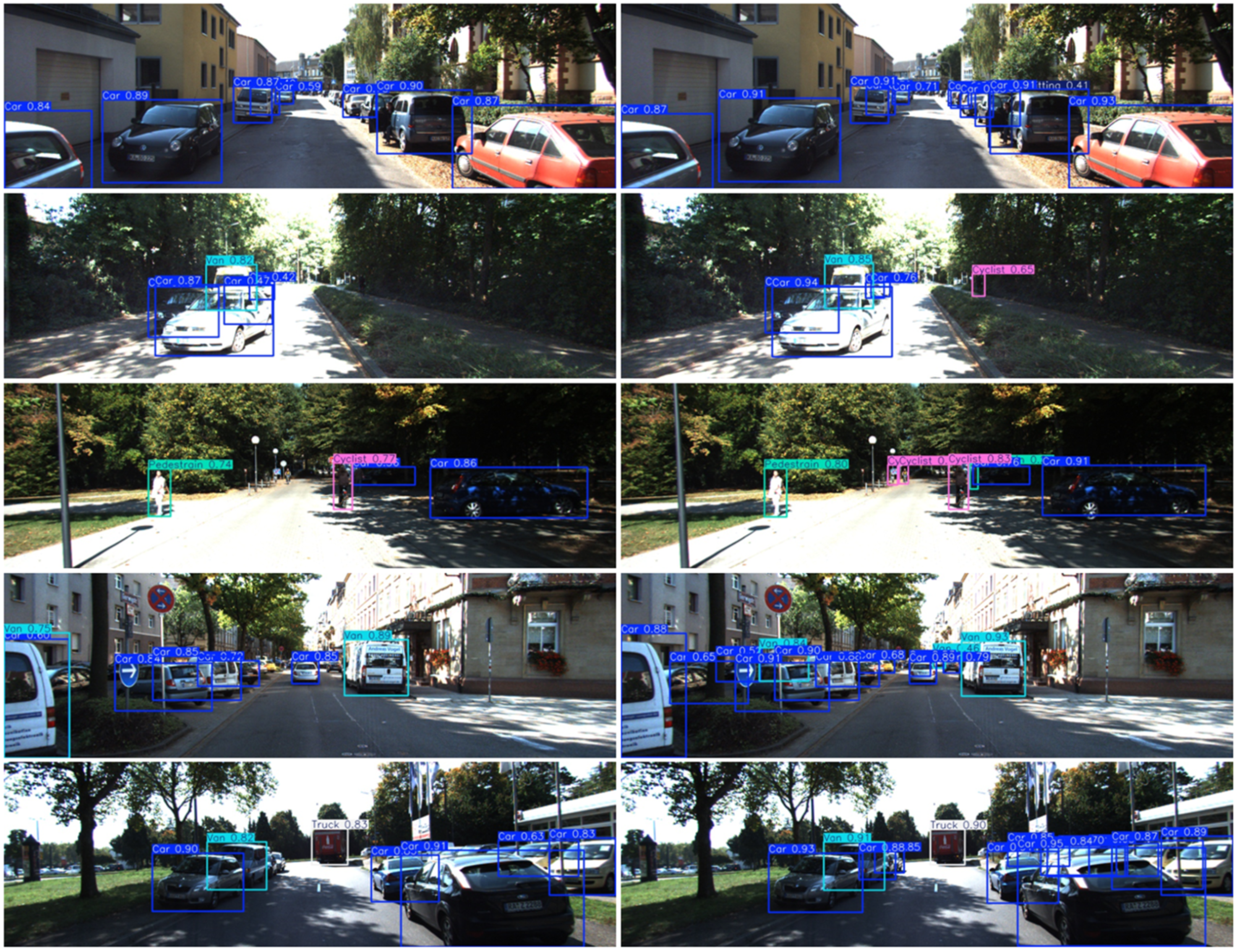 To more intuitively demonstrate the practical effects of the improved algorithm, we selected several samples from the KITTI dataset exhibiting misdetections and missed detections due to occlusions and long distances for comparative analysis. As shown in Figure 6, the left side displays the detection results of YOLOv11n, while the right side presents those of the improved model. From the comparison, it is evident that the improved model comprehensively outperforms the baseline model in detection accuracy. Further analysis reveals that the baseline model is prone to misdetections and missed detections when processing small targets such as pedestrians with colors similar to the environment, as well as vehicles with large-area occlusions. In contrast, the improved model, through enhanced feature extraction and contextual association capabilities, successfully identifies these missed and occluded targets, thereby significantly improving detection reliability in complex road scenarios.