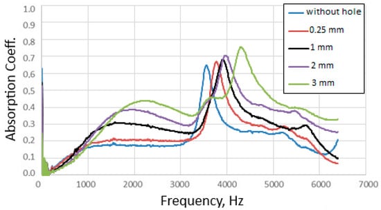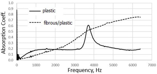The differences in the acoustic properties of both sides of the composite are presented in Figure 4. Positioning the composite with a fibrous/plastic layer with the front end to the incident sound wave results in the dependence of the absorption coefficient on the sound frequency typical for porous fibrous materials [50]. In the sound frequency range under study, the absorption coefficient increases in direct proportion to the increase in frequency. This relationship is also observed when the through hole acting as a Helmholtz resonator in the composite is made, Figure 5. On the other hand, by positioning the composite with a plastic layer facing the incident sound wave, the sound absorption mechanism changes. A sharp peak is clearly visible, indicating a significant increase in the value of the sound absorption coefficient in a narrow frequency band, Figure 4. A similar effect is achieved for resonating sound absorption structure, containing, e.g., a perforated plate, nanofiber membrane, and a cavity [51,52].