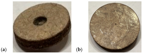 Photograph of a composite with a hole acting as a Helmholtz resonator—(a) view from the side of the cavity in fibrous/plastic layer; (b) view from the side of the neck in plastic layer.