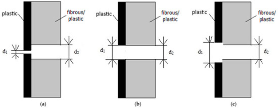 Diagram of a composite with a through-hole with a diameter in the plastic layer (d1) and in the fibrous/plastic layer (d2)—(a) d1 < d2; (b) d1 = d2; (c) d1 > d2.