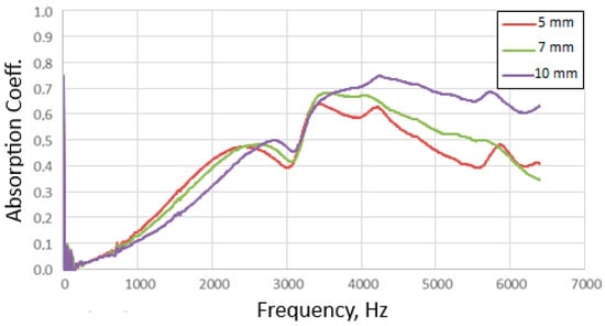 A fibrous composite, like any fibrous material, is characterized by uneven structure. Investigation of samples taken from different places in the material may involve testing a slightly different material structure. Due to the fact that the structure of the actual fibrous composite is not identical throughout the volume, the absorption coefficient-frequency relationship curve for samples cut close to each other may differ slightly, Figure 8.