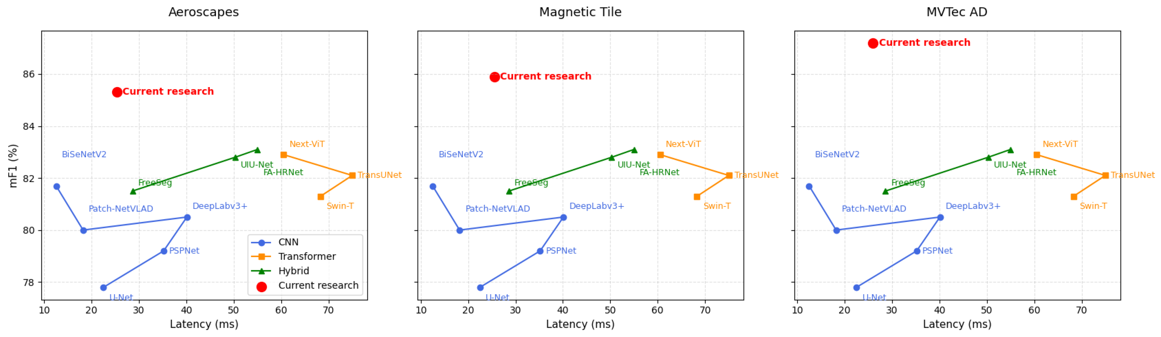 Lightweight hybrid networks such as Patch-netvlad and BiSeNetV2 achieve very low latency (12–19 ms), yet their mF1 and PA remain lower than those of larger hybrid or Transformer models, revealing the trade-off between efficiency and robust defect modeling. FreeSeg also exhibits reduced latency (28–30 ms) with moderate performance, further illustrating this compromise.