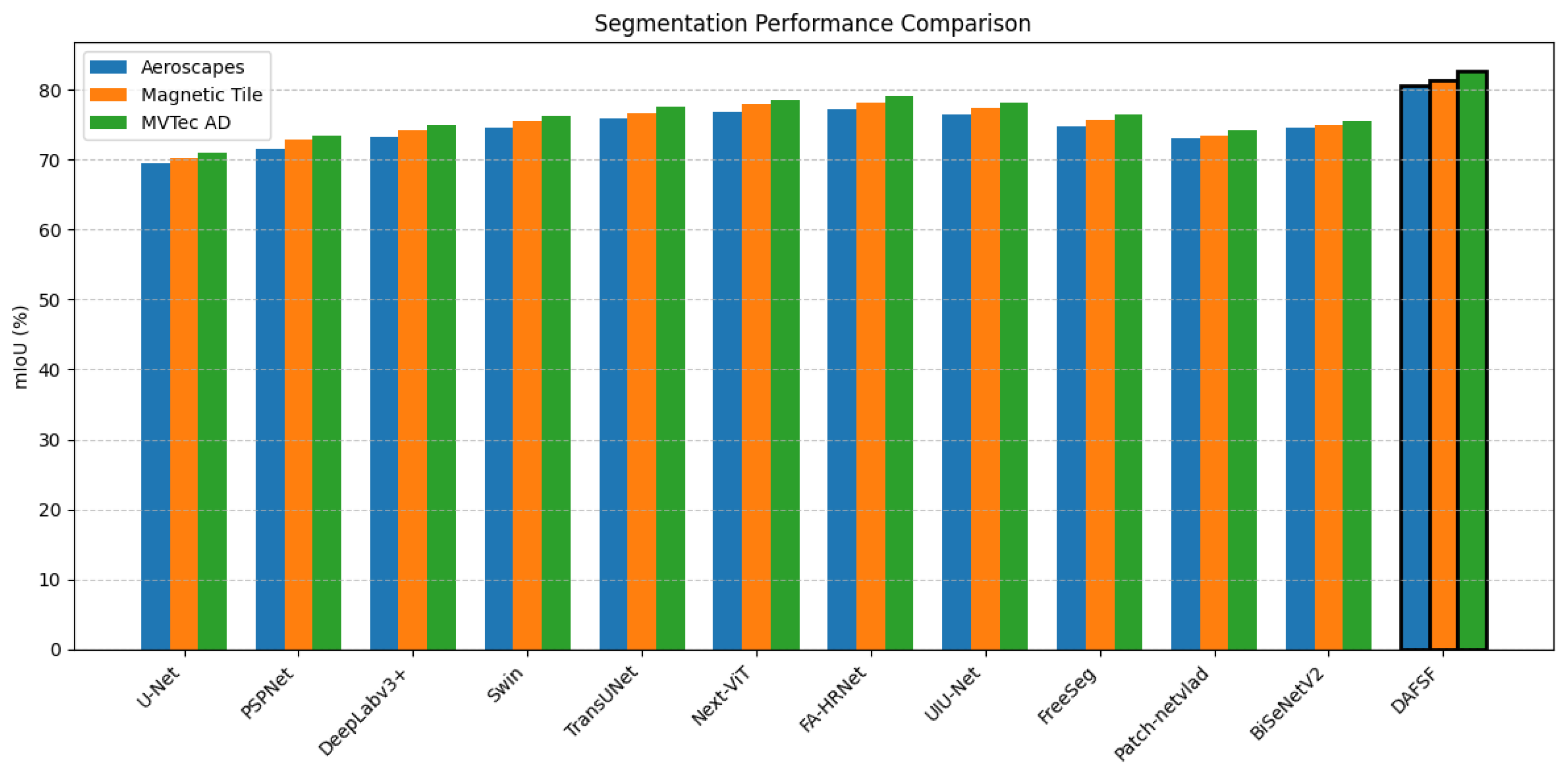 Figure 6, DAFSF consistently outperforms all baseline models across three representative datasets, including Aeroscapes, Magnetic Tile, and MVTec AD, in terms of mIoU. This indicates that the framework not only achieves higher segmentation accuracy but also generalizes well across diverse domains characterized by small, irregular, and noisy defect patterns. Furthermore, the parameter sensitivity analysis in
