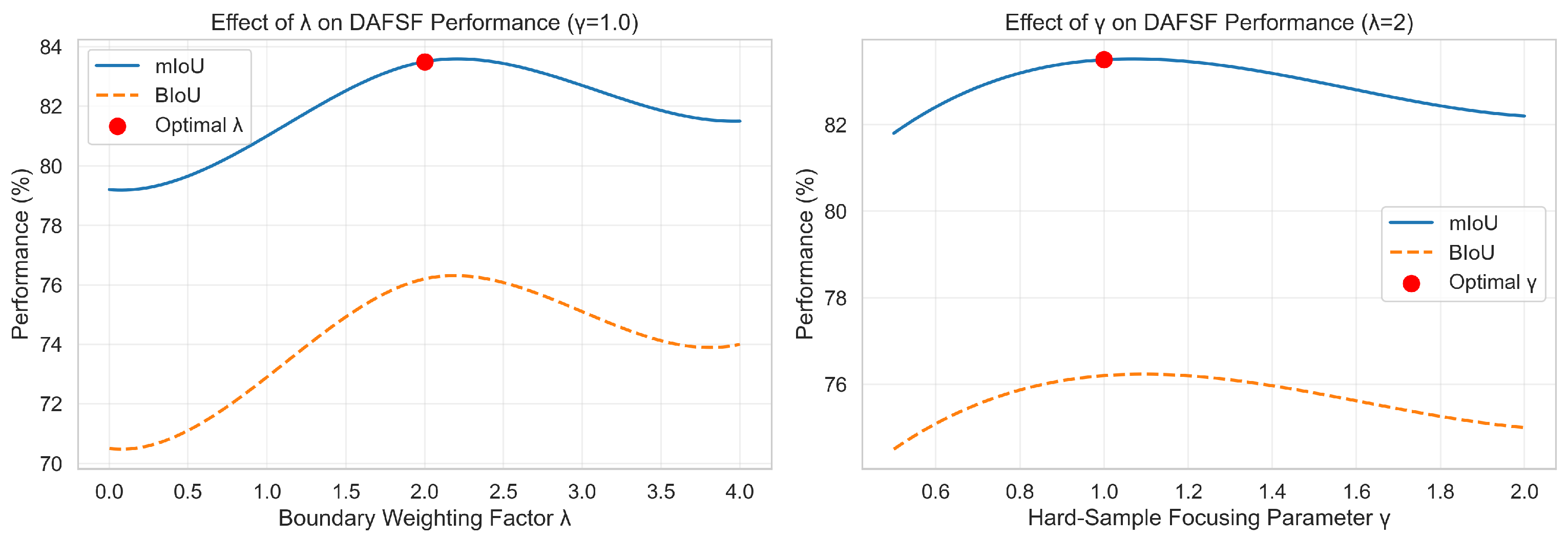 demonstrates that carefully calibrated hard-sample weighting enhances the model’s ability to learn from challenging regions, whereas excessive focusing may lead to instability and performance degradation. The presence of optimal parameter points, marked by red dots, further confirms the balanced trade-off between boundary precision and sample difficulty. Overall, these results not only validate the superiority of DAFSF over existing approaches but also demonstrate its stability and adaptability under different parameter settings, reinforcing its practical applicability to real-world fault segmentation scenarios.