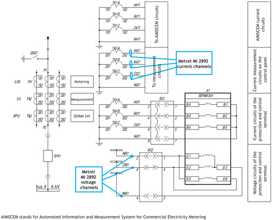 At the second stage, 7-day PQI measurements were taken using a Metrel MI2892 instrument with different aggregation time intervals (a 10 min interval complying with the standard [22] requirements and 1 min, 10 s, and 1 s intervals) at the same point under identical substation operation conditions to evaluate resolution impact on the results. A diagram of instrument connection to the enterprise power system is shown in Figure 2.