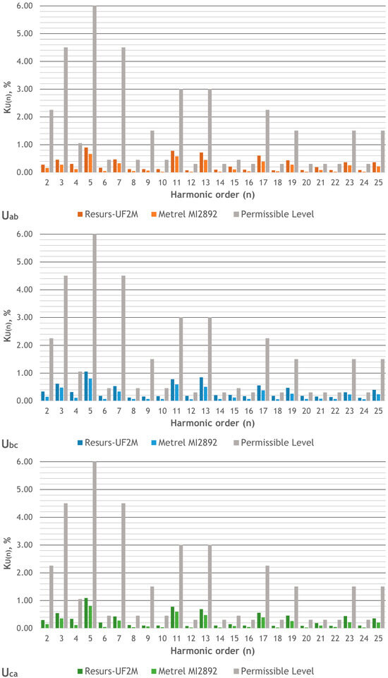 The permissible levels of individual harmonic voltages in 6–25 kV power systems for 95% (KU(n)(95%)) and for 100% (KU(n)(100%)) of measurement dataset according to GOST 32144-2013 [22].